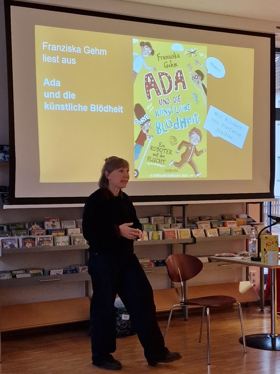 Im Anschluss daran stellte die Autorin ihr Buch „Ada und die künstliche Blödheit“ als ersten Teil einer Trilogie vor. (In diesem geht es um die KI in Adas Roboter, die sich als künstliche Blödheit mit Herz herausstellt.) Aus dem Buch las Frau Gehm dann einige Textpassagen vor, welche durch Bilder veranschaulicht wurden. Zwischendurch sprach die Autorin zur Auflockerung mit den Kindern über den gelesenen Inhalt, erzählte die nächste Einheit um dann wieder bestimmte Teile vorzulesen.