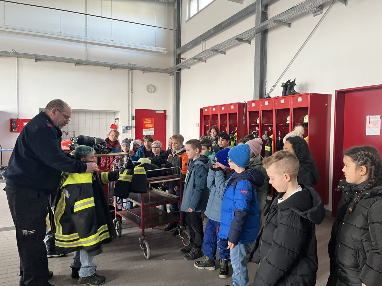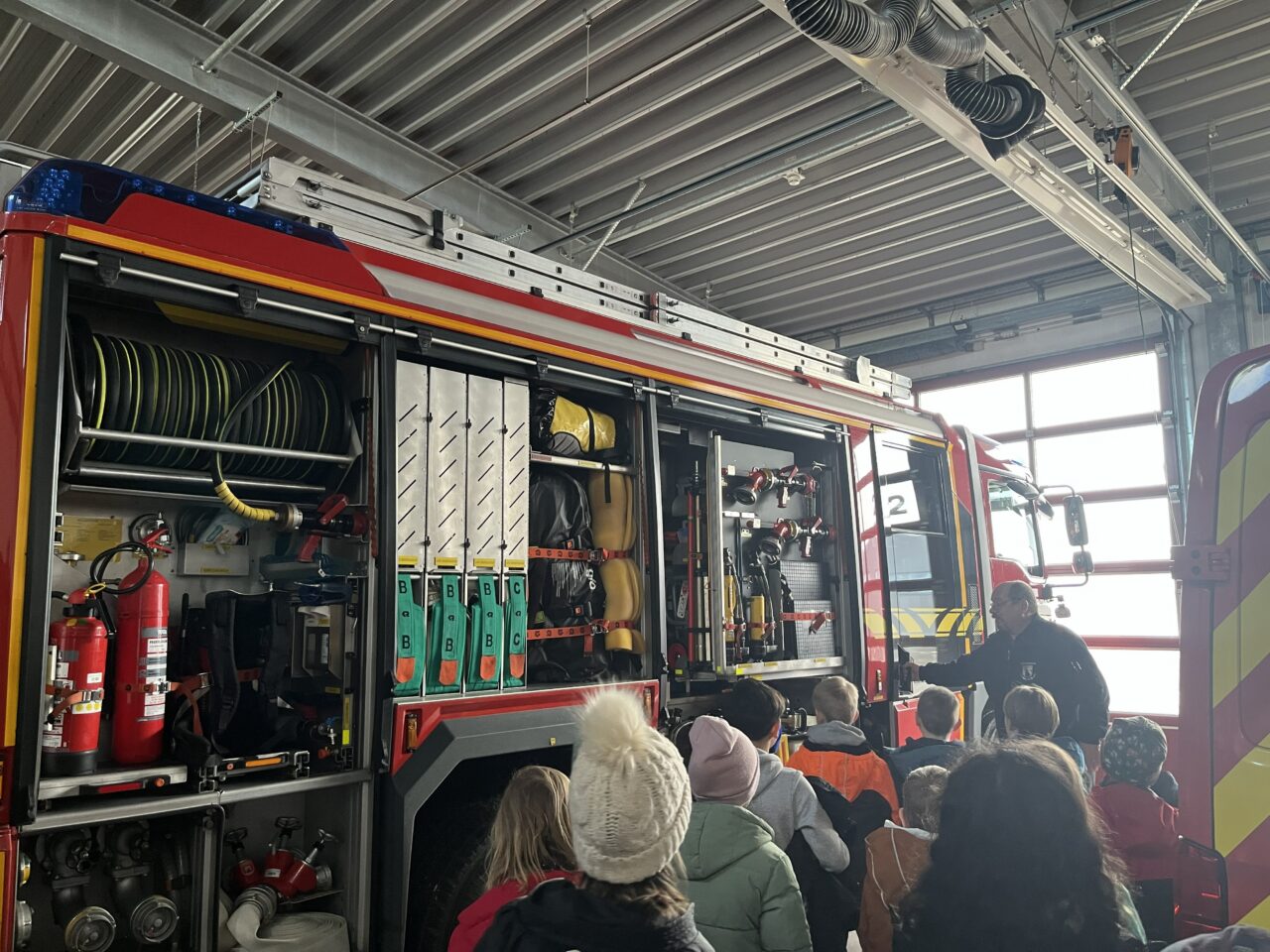 Nach dieser Einführung durften die Schülerinnen und Schüler schließlich die große Fahrzeughalle betreten. Dort standen mehrere Einsatzfahrzeuge der Feuerwehr bereit. Besonders beeindruckend waren die zahlreichen Gerätefächer an den Seiten der Fahrzeuge. In ihnen befinden sich viele wichtige Ausrüstungsgegenstände, zum Beispiel Feuerwehrschläuche, Strahlrohre, Feuerlöscher, Atemschutzgeräte und verschiedene Werkzeuge. Die Kinder lernten, dass jedes Gerät seinen festen Platz im Fahrzeug hat, damit im Einsatz keine Zeit verloren geht.